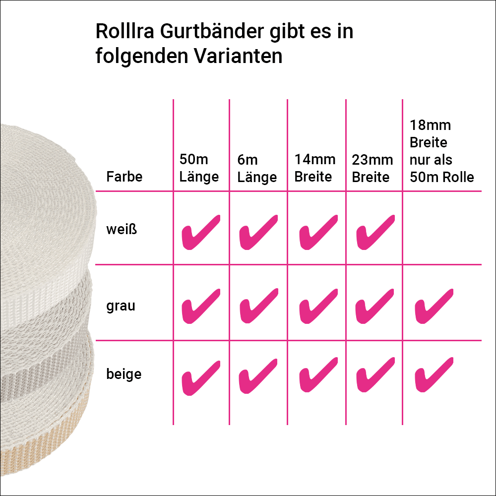 Sie erwerben hier 18mm Gurtband als 50m-Rolle und in gewünschter Farbe.